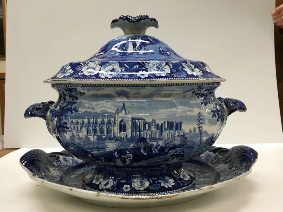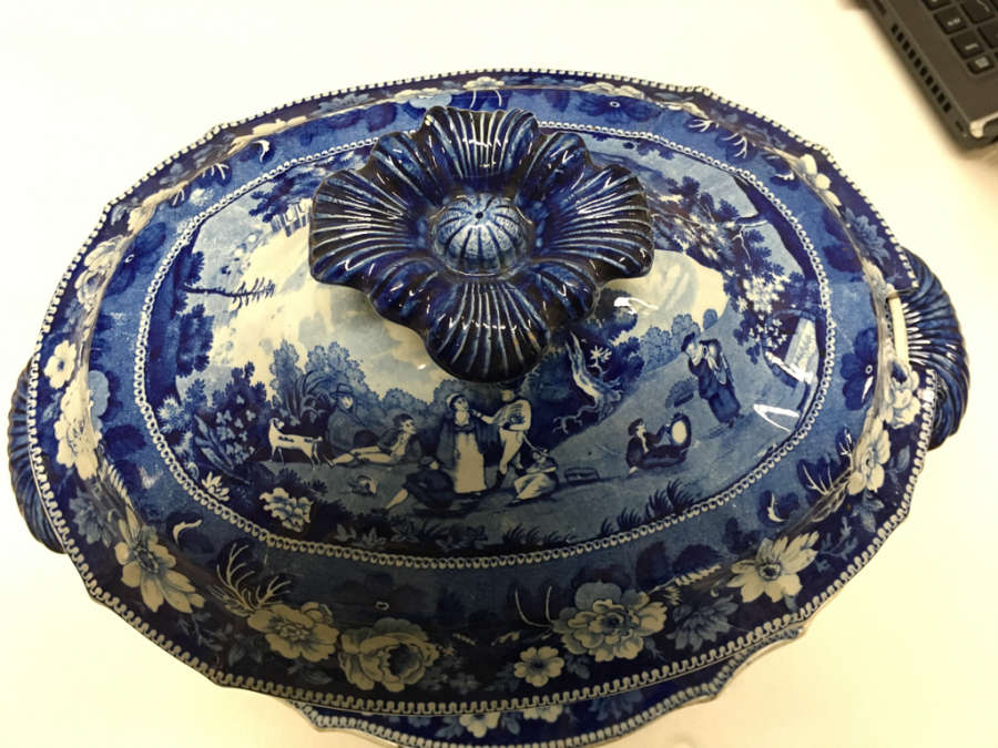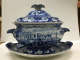 Marks: Title on ribbon with flower spray on back of tureen and platter