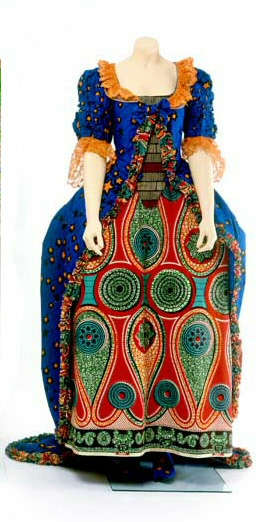 Three mannequins on glass bases, Dutch wax-printed cotton fabric, and leather shoes