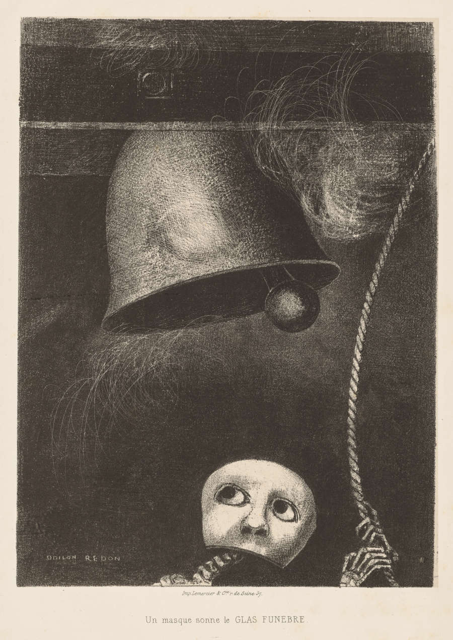 Lettered: LL: "Odilon Redon"; LC: "Imp. Lemercier & C.ie r. de Seine 57."; and "Un masque sonne le GLAS FUNEBRE."