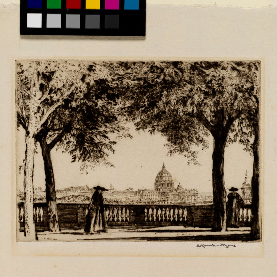 Original--Recto:in pencil signed, LR:Muirhead Bone; inscribed, LL corner:14 IV; titled, LC:Under the Pincian Trees3 ; numbered, LR corner:P. 1271Verso:in pencil initialed, UL of platemark:M; numbered, LR of platemark:8