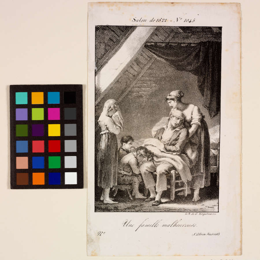 Original--Verso:in pencil in center:Gg II/IV Prud'hon/Lithographie originale/Epreuve du le tirage; in LR:686 (within an circle)In Plate--In UC:Salon de 1822-N°. 1045; signed in LL of image:Prud'hon; below image in LR:Lith: de G: Engelmann; titled, LC:Une famille malheureuse; in LL:N°; in LR corner:(L'Album Journal)