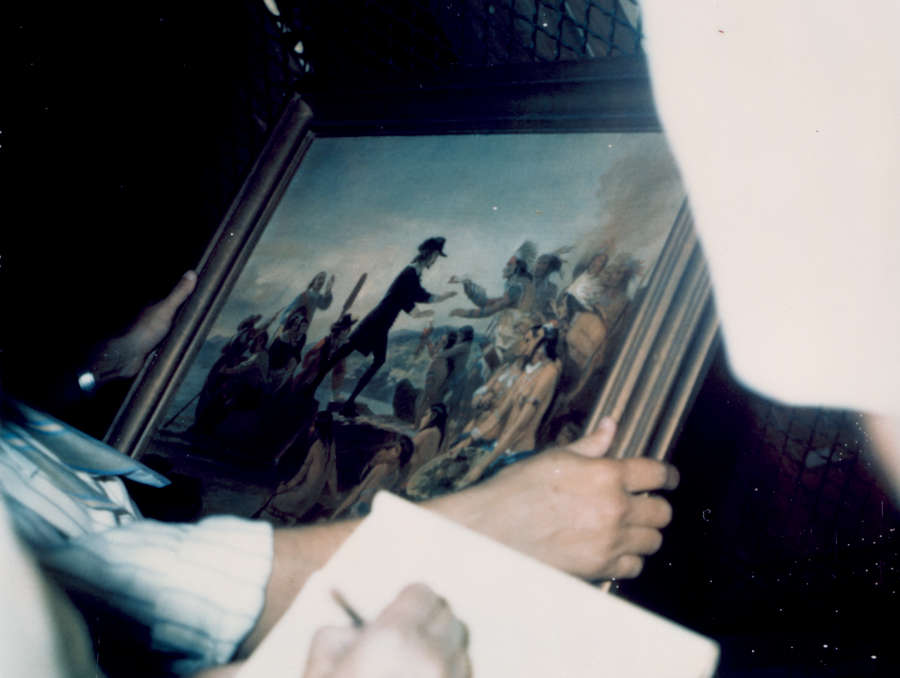 Untitled (Art Handler holding Alonzo Chappel painting, "The Landing of Roger Williams")