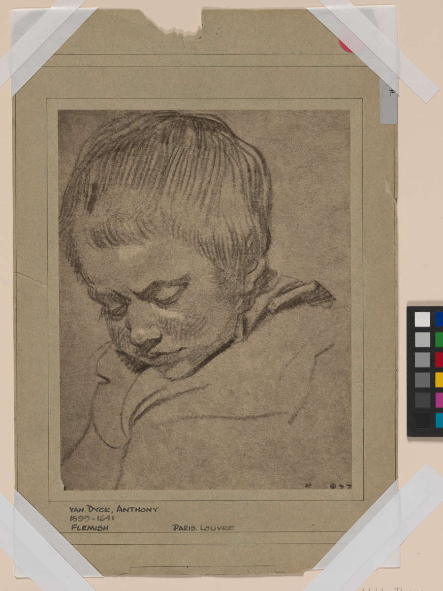 Recto LL, black ink on board: "VAN DYCK, ANTHONY / 1599-1641 / FLEMISH"; LC: "PARIS.LOUVRE". Recto LR: "M [stamp] 77". UL, black ink on board: "DP.0121". On verso, RISD Library stamp in black ink.