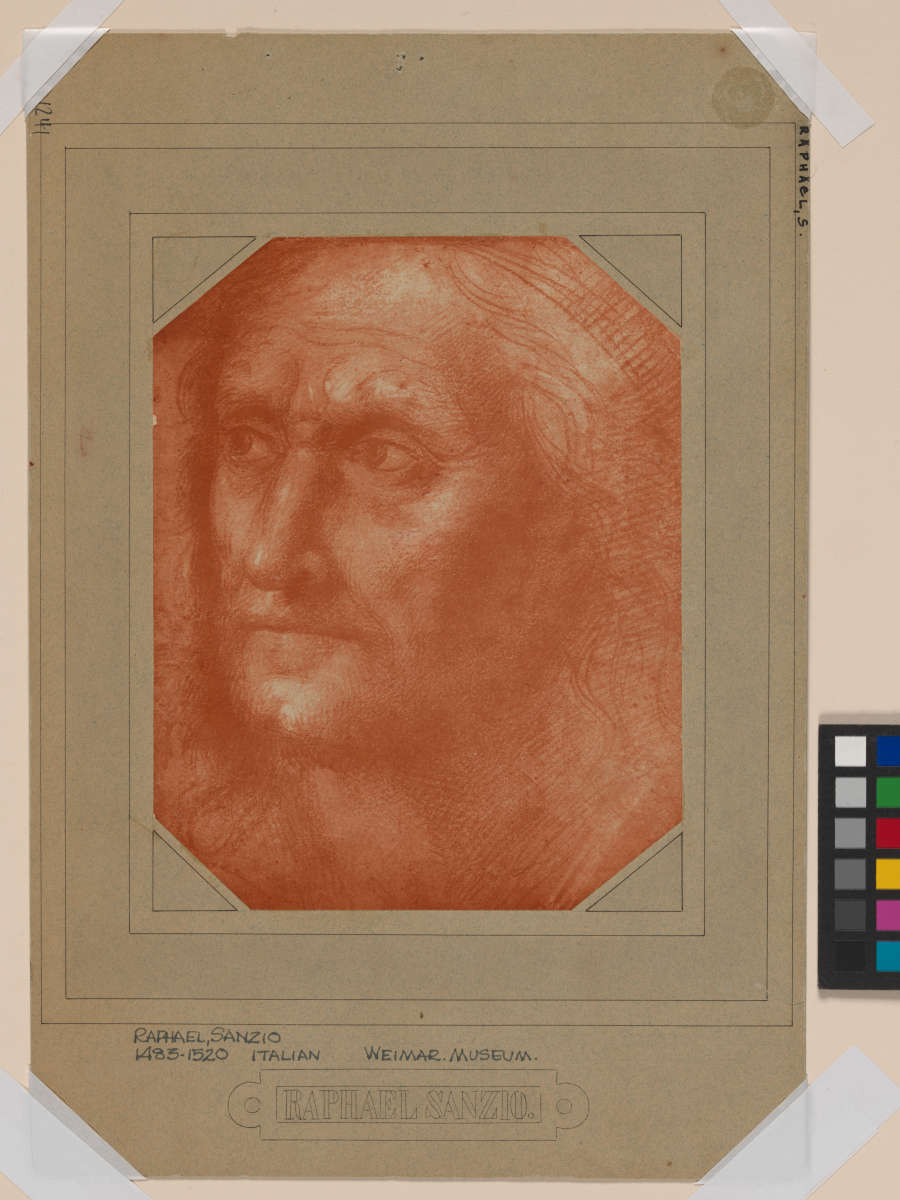 Recto LC, in ink: "RAPHAEL, SANZIO / 1483-1520 ITALIAN WEIMAR.MUSEUM". Recto TR in ink: "RAPHAEL, S." In black ink, UR: "DP.1241". Recto: "RAPHAEL SANZIO". Verso, Inscribed in black ink: "Raphael / Weimar Museum". Verso, Black stamp of RISD Library.