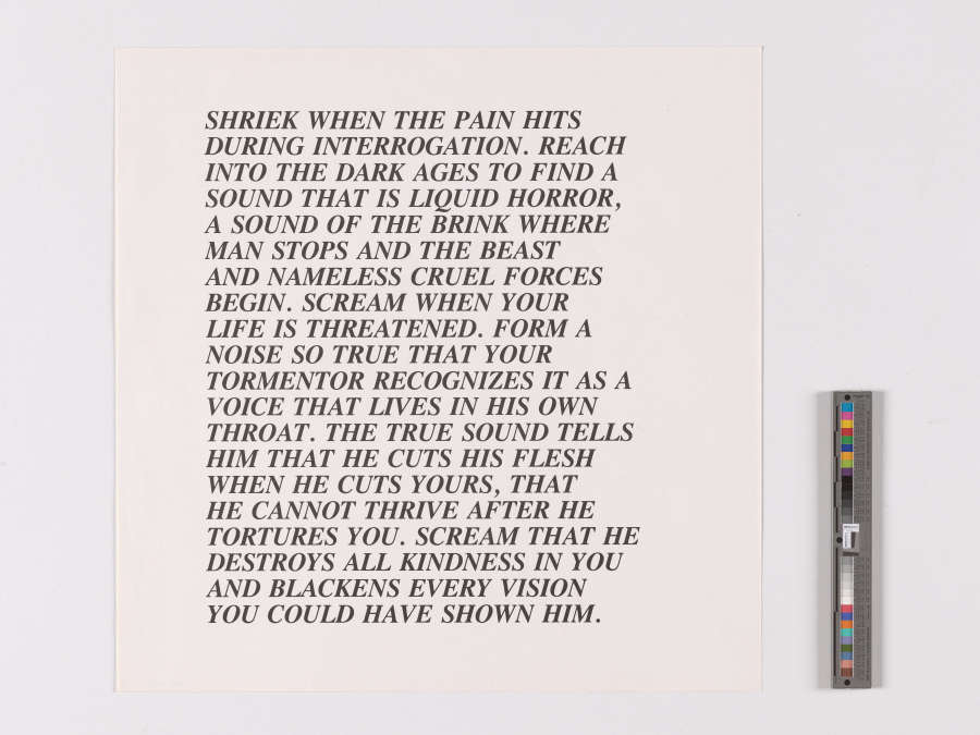 Untitled ("SHRIEK WHEN THE PAIN HITS DURING INTERROGATION."); Inflammatory Essays, 1979-1982 text date