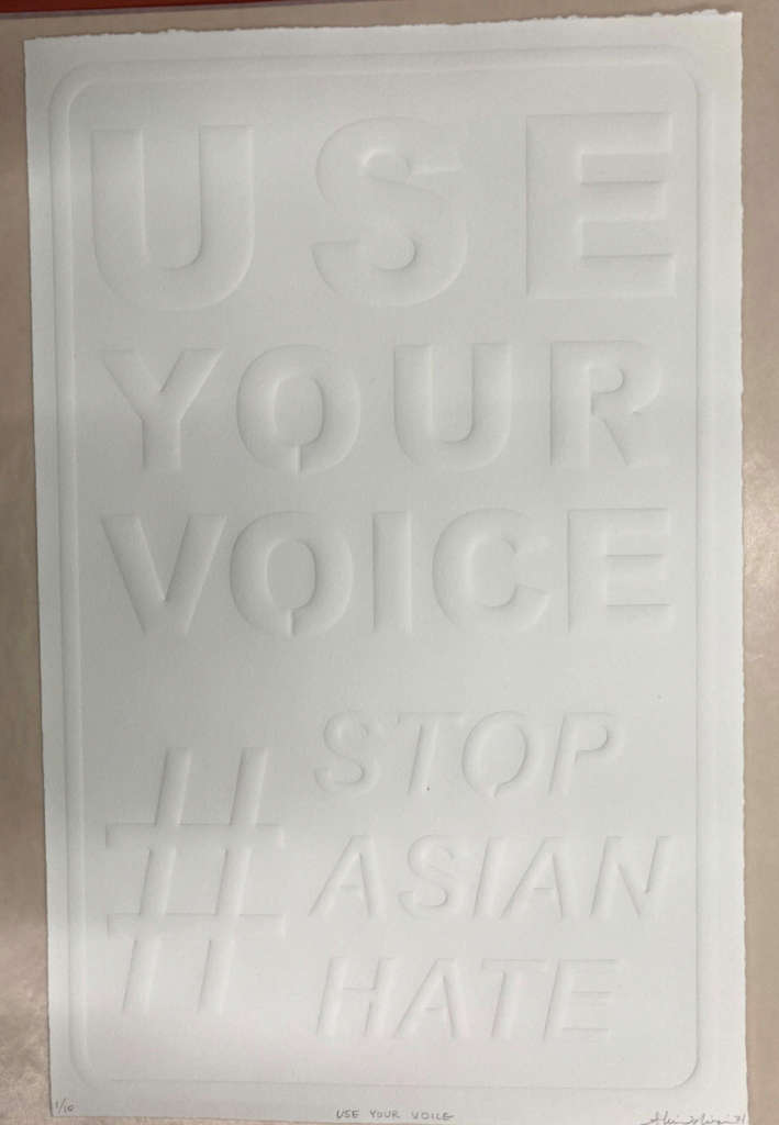 Numbered, inscribed, and signed in graphite on recto bottom: “1/10 USE YOUR VOICE Shin Mizin 21”