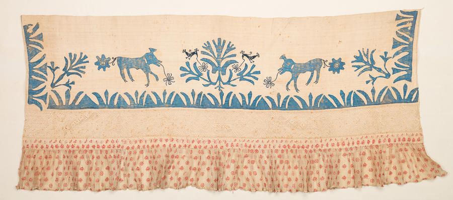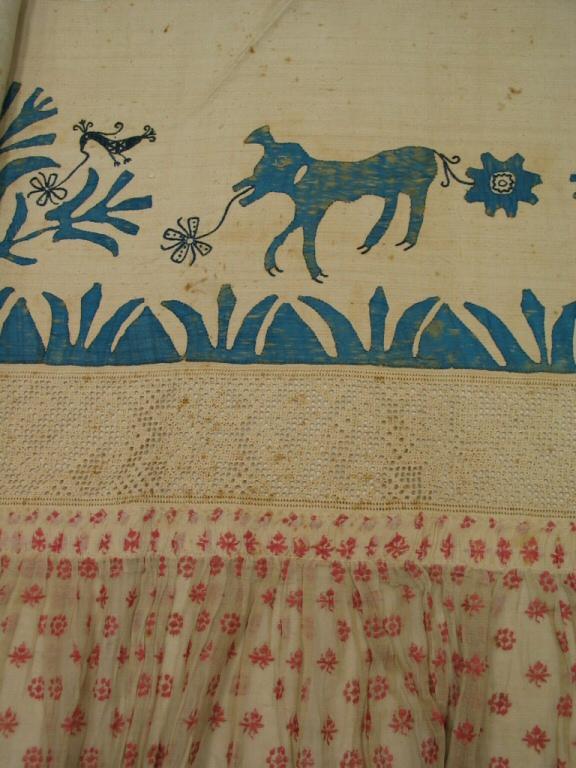 Linen plain weave with appliqued silk and drawn-work insertion, muslin ruffle