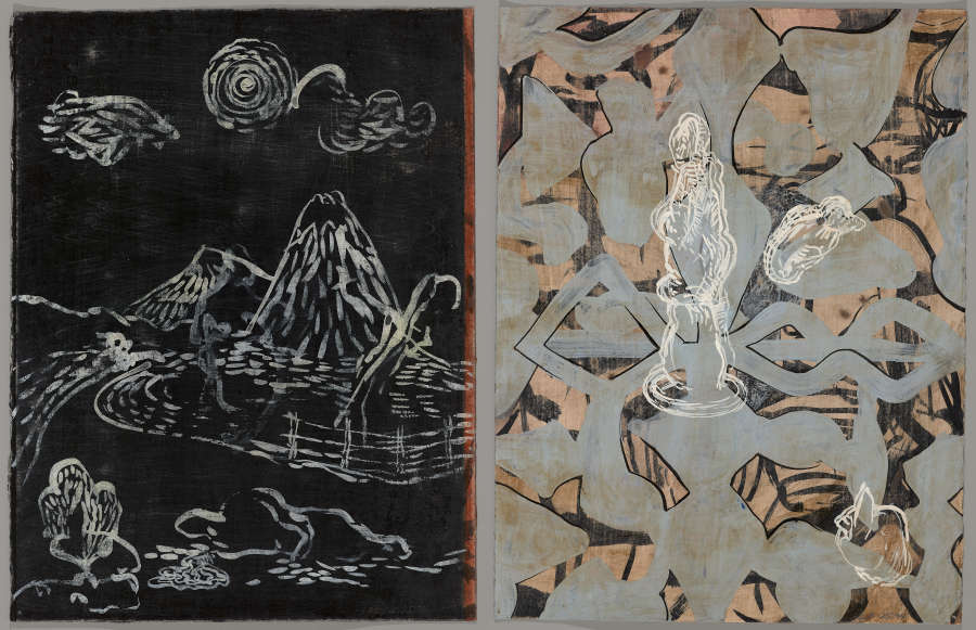 Ink, watercolor, coffee, gesso, clay and graphite on two sheets of prepared paper