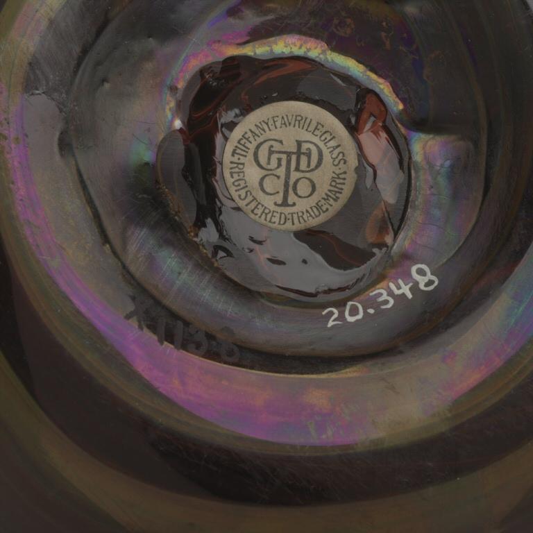 Engraved on bottom: X1138 (X denotes pieces not made for sale), and a small round paper label with TGDCo in monogram (Tiffany Glass and Decorating Company) surrounded by: Tiffany. Favrile. Glass. Registered. Trade·mark.Favrile glass: opaque blown glass with iridescent surface.Squat, irregular shape; dark purplish-brown streaked with amber, green and yellow.