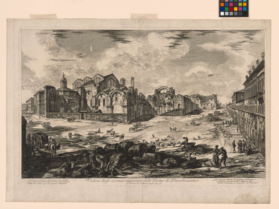 Lettered LL: "1. Granari... Negroni." LC: "Veduta degla avanzi superiori delle Terme di Deocleziano 3. Chiessa di S. Maria degli Angeli" LR: "Caval. Piranesi F." "La maggior... Ospizio."