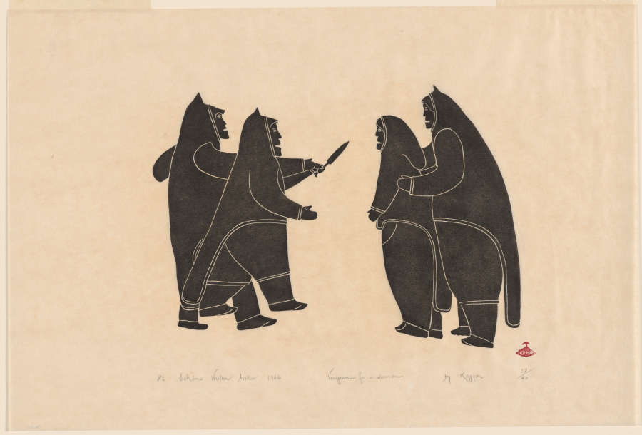Inscribed in pencil across bottom from left to right:#2 Eskimo Western Arctic 1966 Vengeance for a Woman by Kagyon 39/40. Blind stamp with Inuktitut word for "genuine" at LR with Holman community stamp above it.