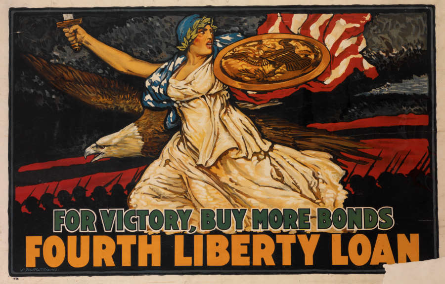 Title printed at bottom: "FOR VICTORY, BUY MORE WAR BONDS / FOURTH LIBERTY LOAN"; artist signature signed in stone in LL corner: "J. Scott Williams"; printed in LL corner: "7-B"