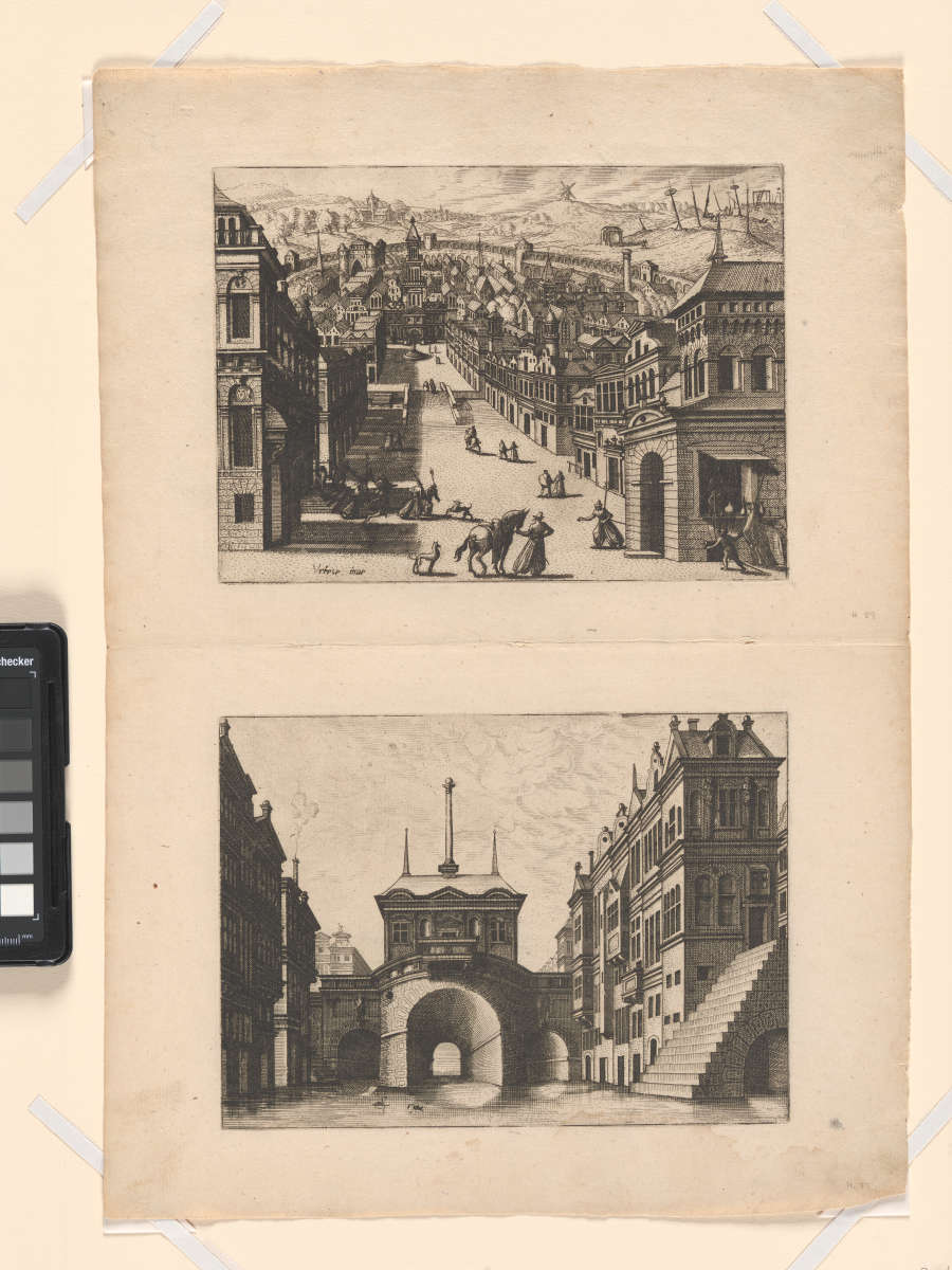 View of a street bordered by houses descending into a town, surrounded by a wall | View of a canal with vaulted bridge, grand staircase rising from the water in the right foreground