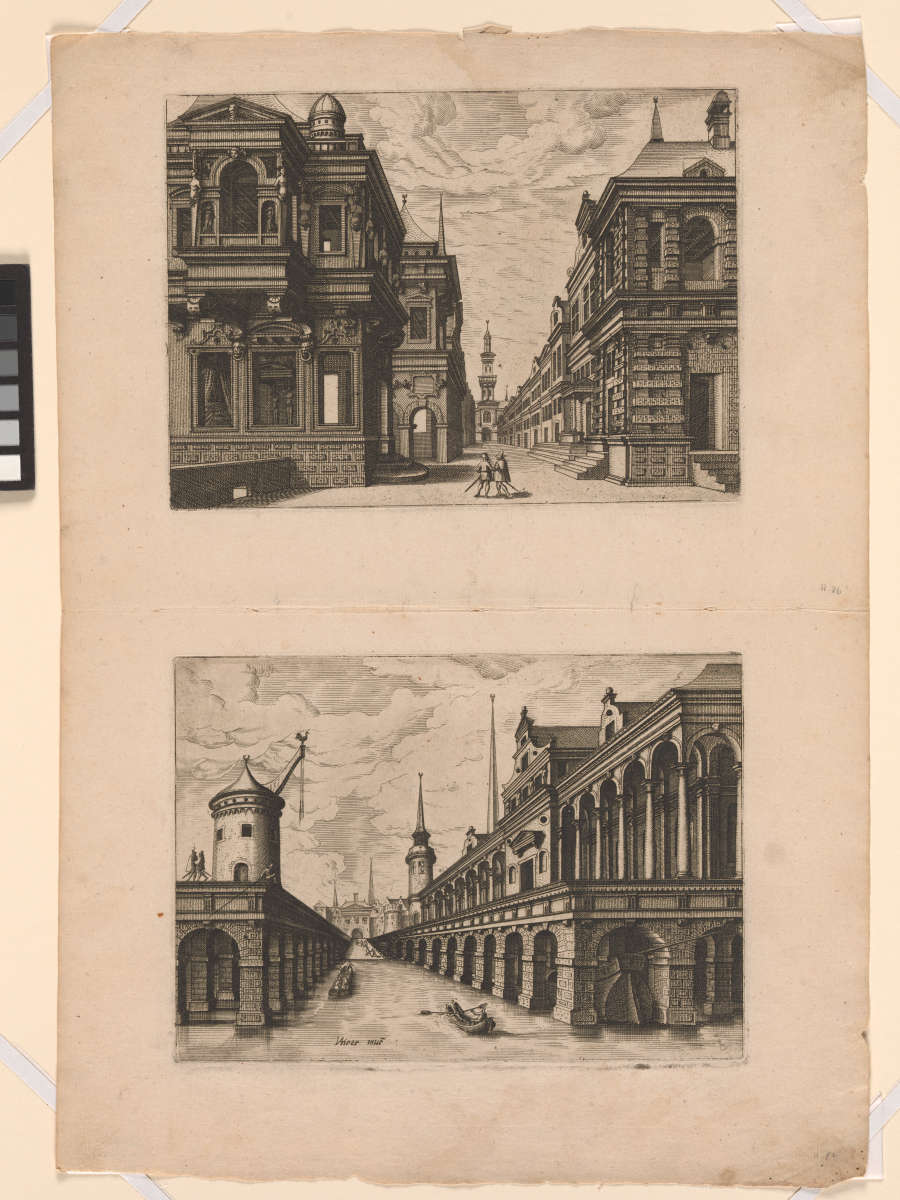 View of a Street with houses on both sides, in the left foreground a palace | View of a harbor canal, on the left a crane and on the right a colonnaded building