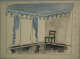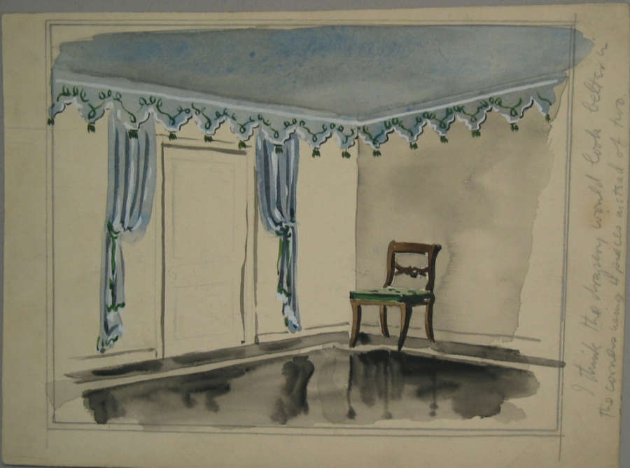 Along the right edge of recto in pencil: "I think the drapery would look better in the corners using 4 pieces instead of two."