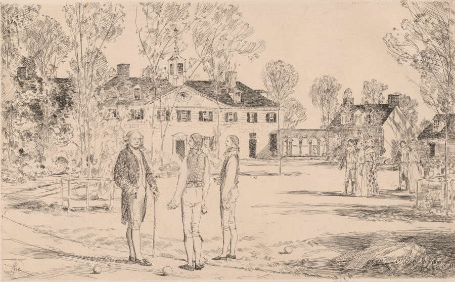 Original--Recto:numbered in pencil in UL corner of sheet and under platemark on left:20; signed under platemark on right:C.H. Verso:in pencil in LR:Washington at Mount Vernon/Original etching by Child eHassam/Serene and Content, Washington enjoys the /sunset of his illustrious career in the peace/and beauty of his beloved estate.In Plate--In LL:SEPT 17/CH (inscribed in a circle)/1932; in LR:Childe Hassam/NOV 27 1932
