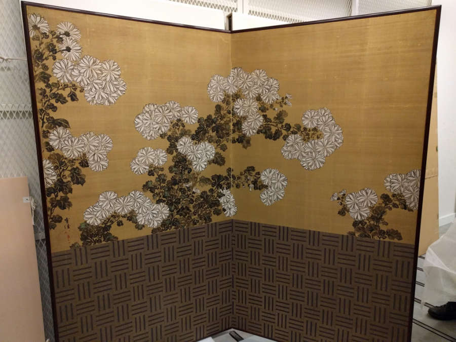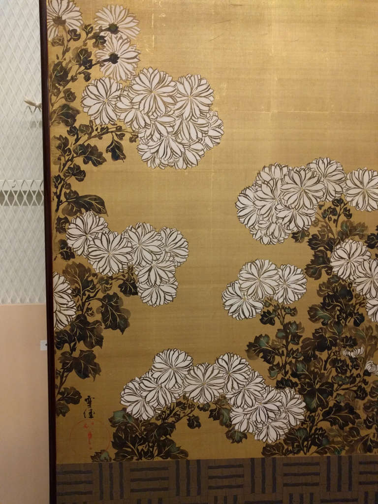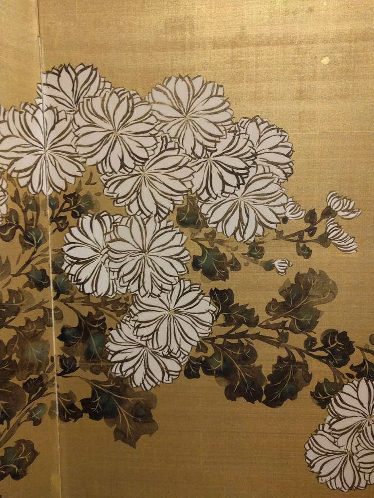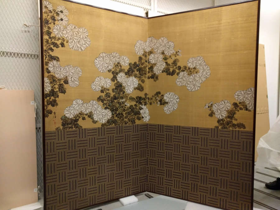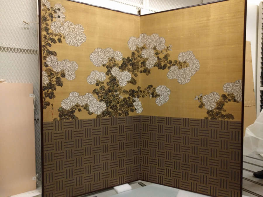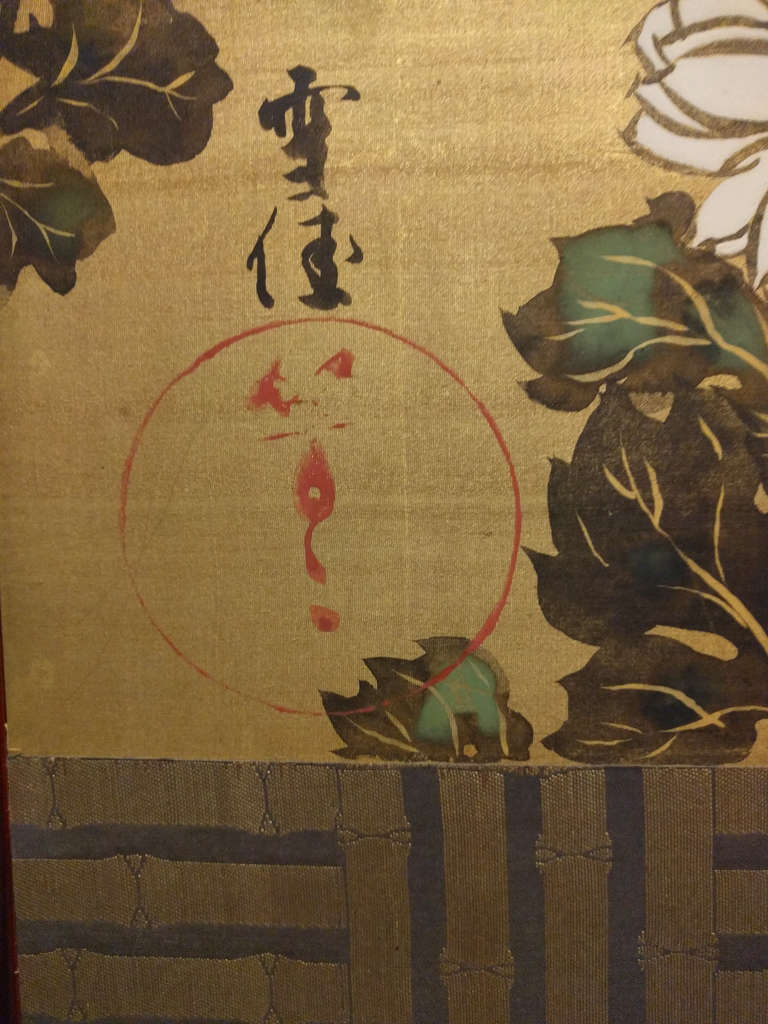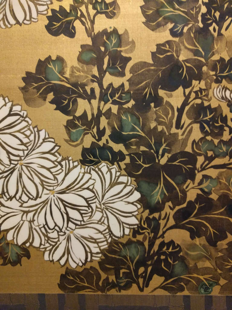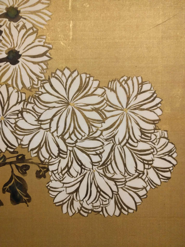 Ink, color, gold, and gofun on silk; compound weave with supplemental patterning