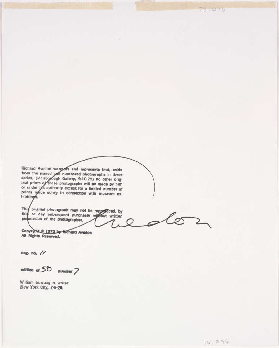 Stamped verification on verso; also:reg. no. 11edition of 50 number 7 Signed in ink across verso:Avedon