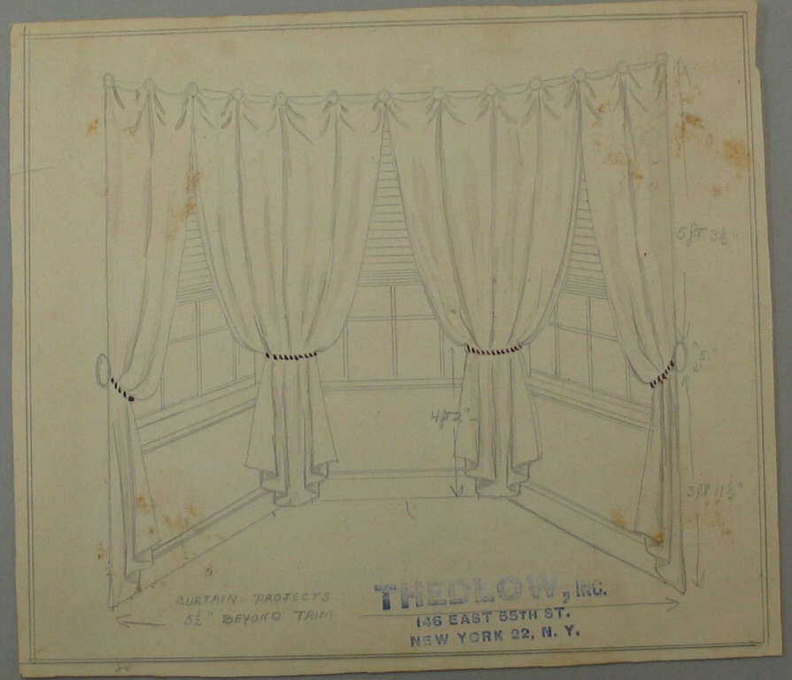 On recto in pencil: "5 ft 3 1/2" / 5" / 4 ft 2" / 3 ft 11 1/2" / CURTAIN PROJECTS 5 1/2" BEYOND TRIM".