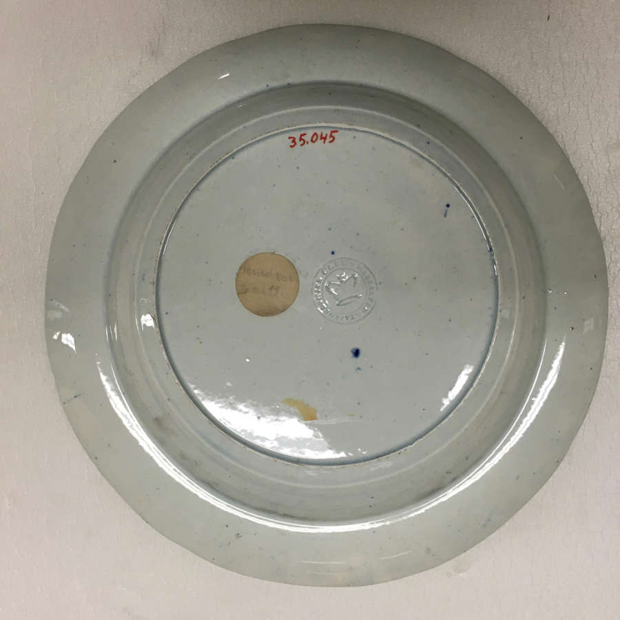 Marks: Maker's name and mark impressed within circle on back.Title peciled on label on back.