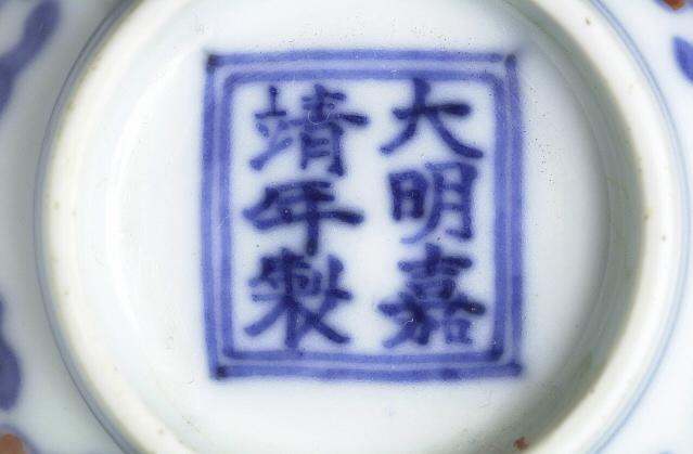 Marks: Mark:Da Ming Jiajing nian zhi, six characters within a double square in underglaze blue on base.