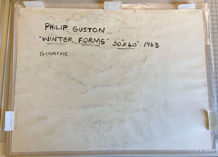 Inscription: in graphite, verso: "Philip Guston / "Winter Forms" 30" x 40" 1963 / Gouache" Credit / Object Number