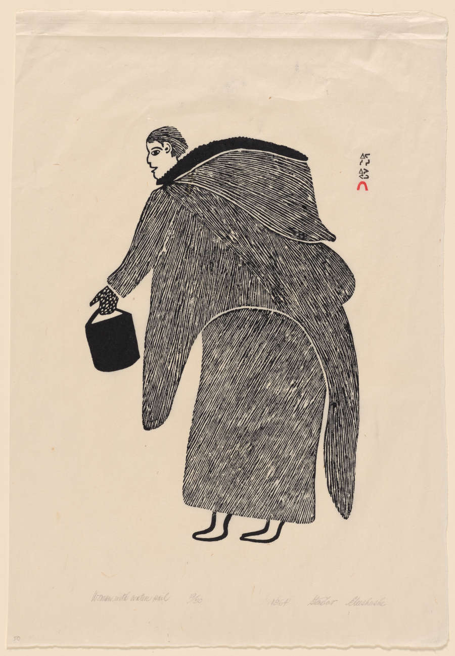 Inscribed in pencil across bottom from left to right:Woman with Water Pail 19/50 Stone Cut Eleeshushe. Cape Dorset community stamp at UR.
