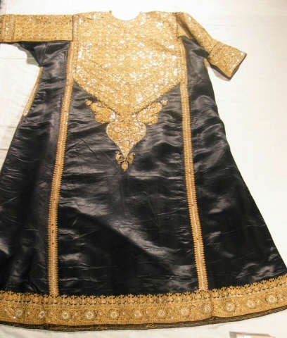Silk, sequin, metallic-wrapped yarn; satin weave with embroidery and appliqué