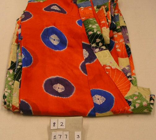 Silk: plain weave, tie-dyed (shibori); and satin damask, stenciled and drawn paste resist-dyed (yuzen)