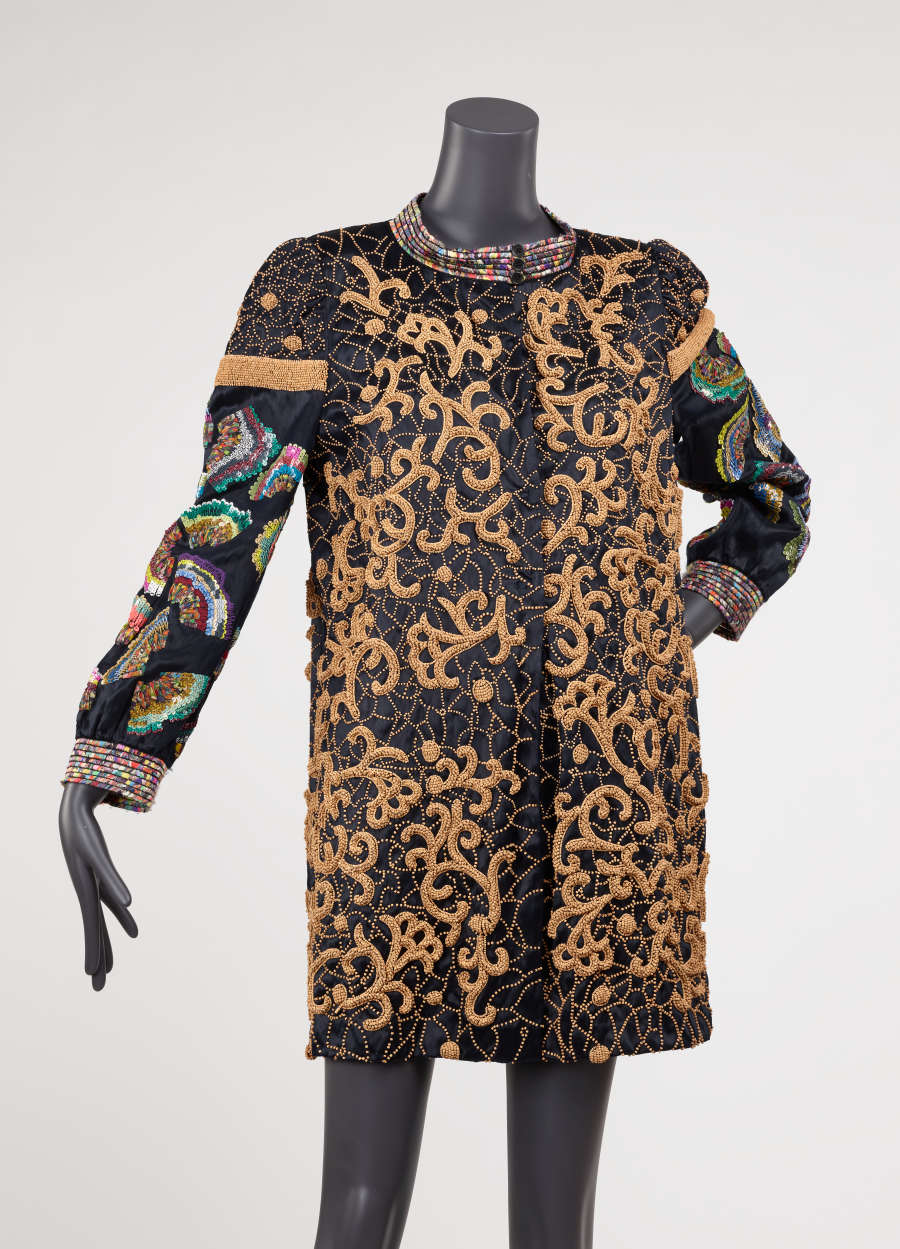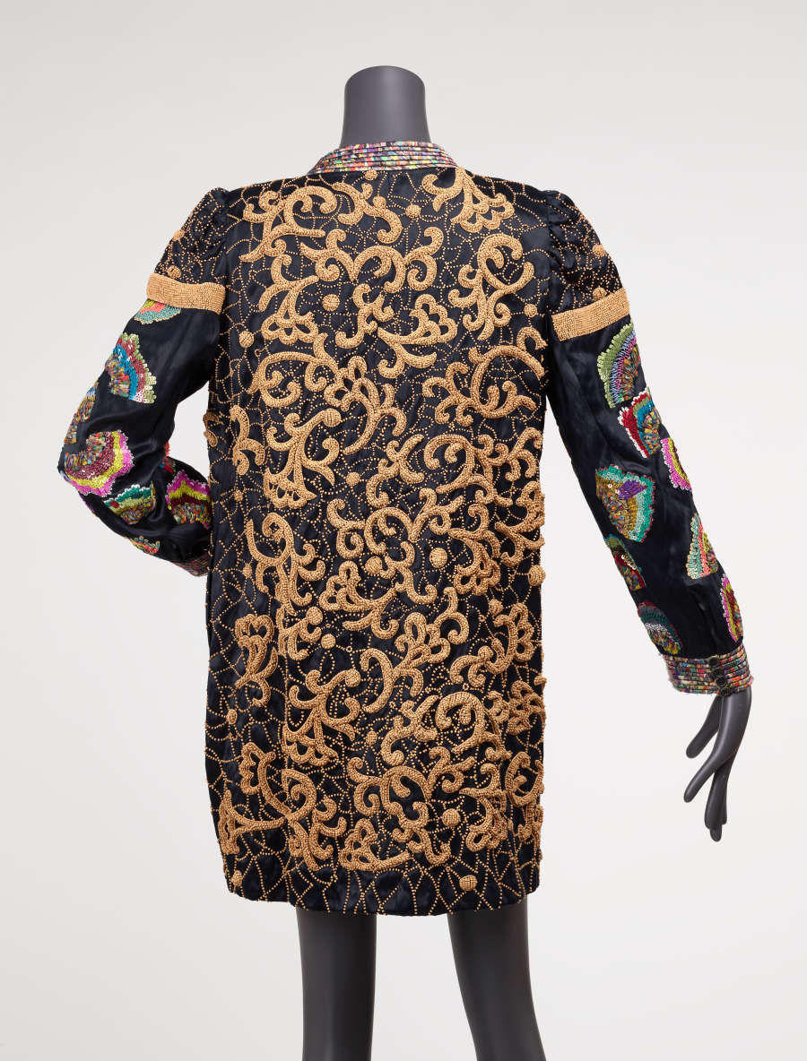60% silk, 36% cotton, 4% metal fiber; Orbis print; embellished with embroidery, plastic sequins, and cork beads