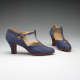 Women's shoes; Blue silk T-strap shoes with rhinestone buckles, ca. 1930