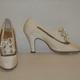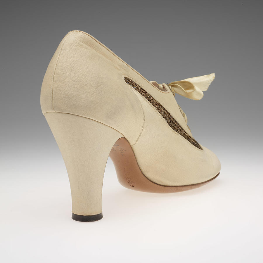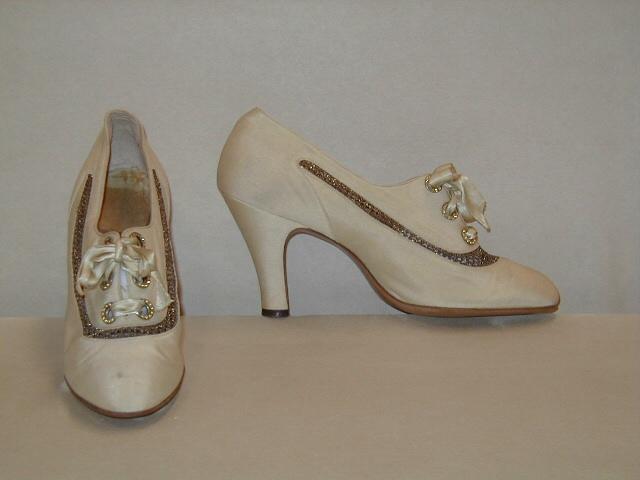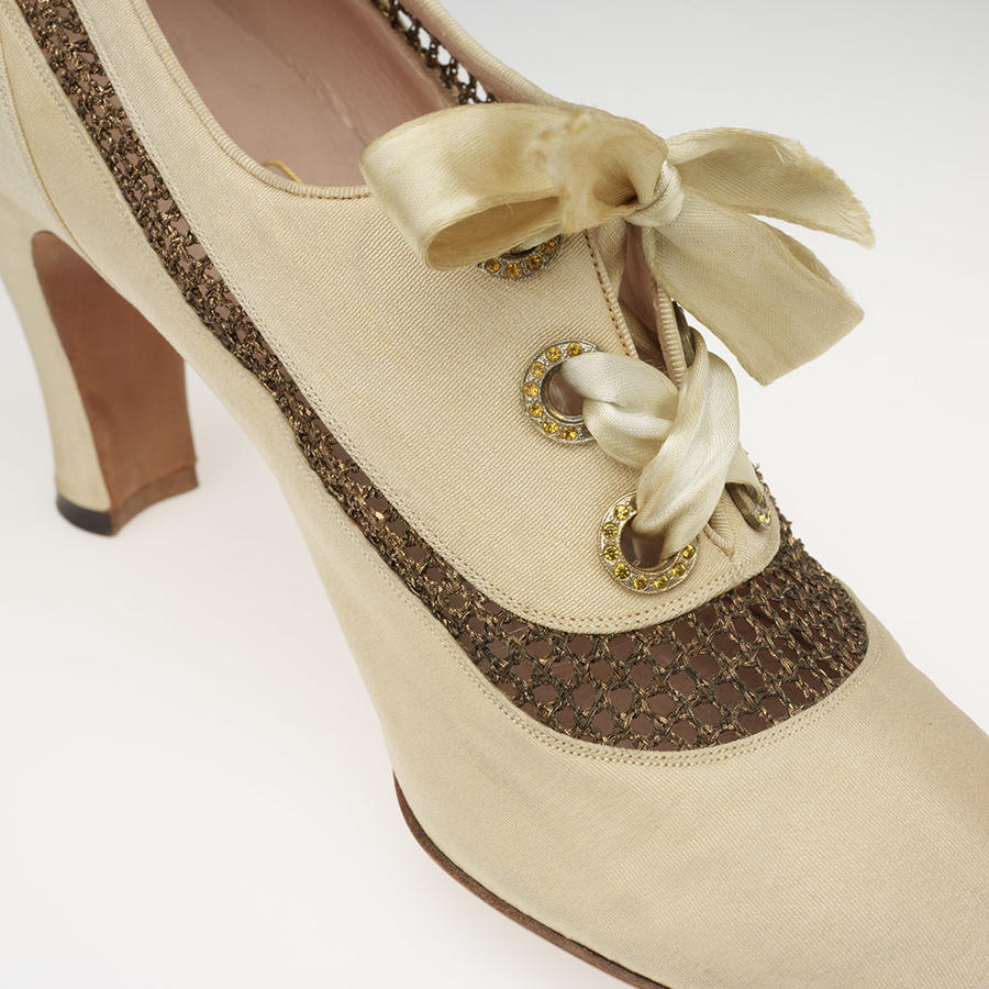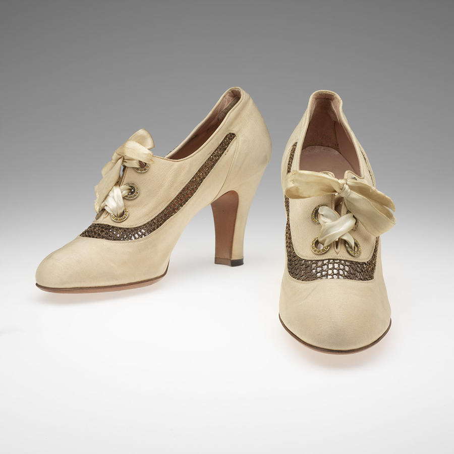 Women's shoes; Cream silk oxford shoes with metallic trim, ca. 1930