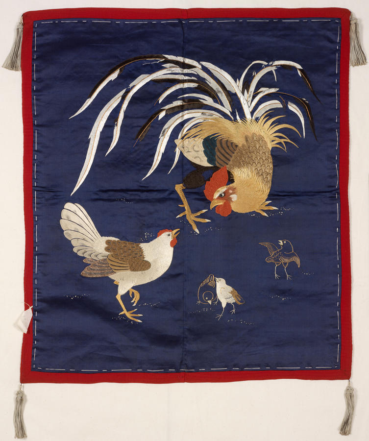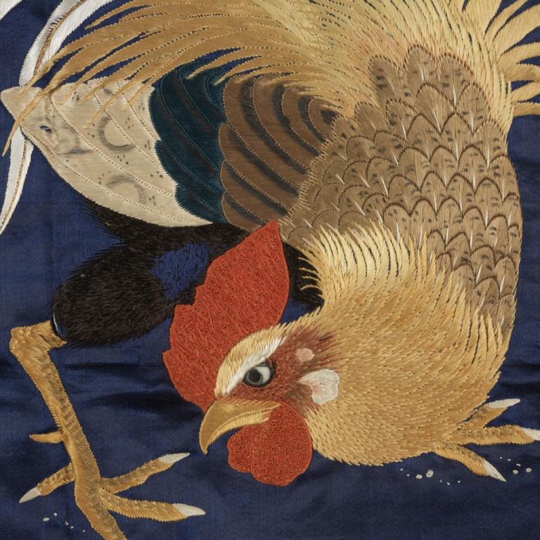 Silk, paint, metallic-paper-wrapped threads; satin weave, embroidery, couched embroidery