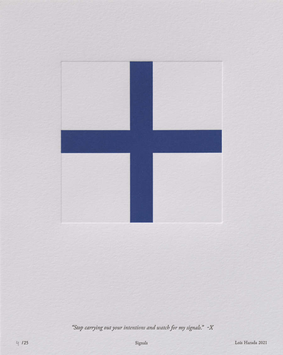 On recto, “4” inscribed in graphite LL within line printed in black ink at bottom that reads “/25 Signals Lois Harada 2021”