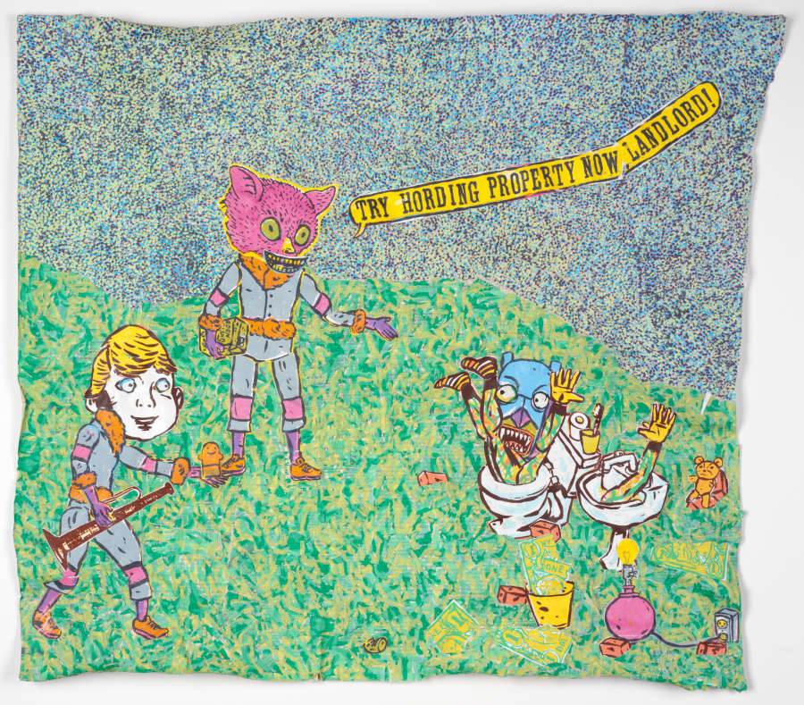 Screenprinted on collage element top right:"TRY HORDING PROPERTY NOW, LANDLORD!"