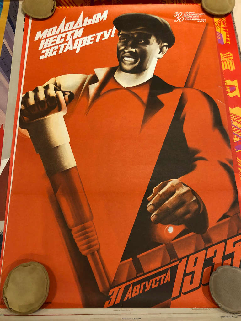 Translation top right corner: 50 Years of Stakhanovite Movement. 50 striking Stahanov’s shifts. Transliteration: 50-letiiu Stakhanovskogo Dvizheniia. 50 udarnykh Stakhanovskikh vakht. Translation top left corner: 31 August 1935. Transliteration: 31 Avgusta 1935