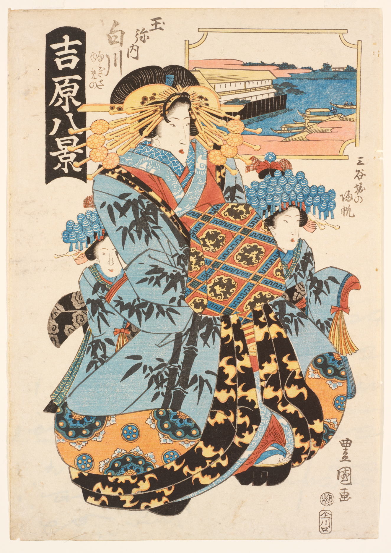 The courtesan Tsukasa and her two kamuro Agena and Kocho of the Ogiya (Ogiyanaitsukasa agena kocho: Daimonguchi no rakugan), Edo Period