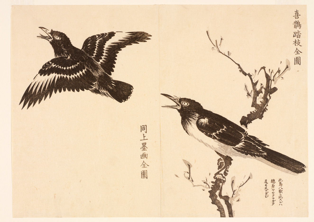 Complete illustration of a magpie in a tree, Edo Period