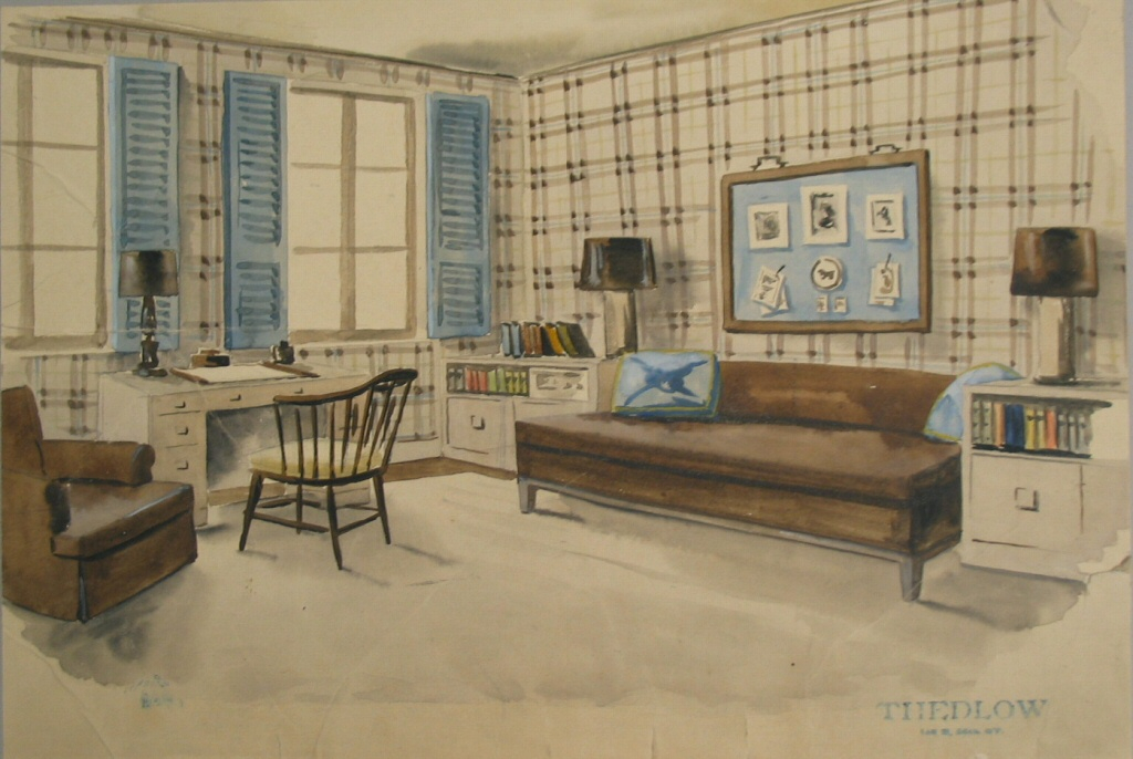 Plan and elevation (in color and black and white) of bar and serving counter folding louvered doors, porch, storage and planting.