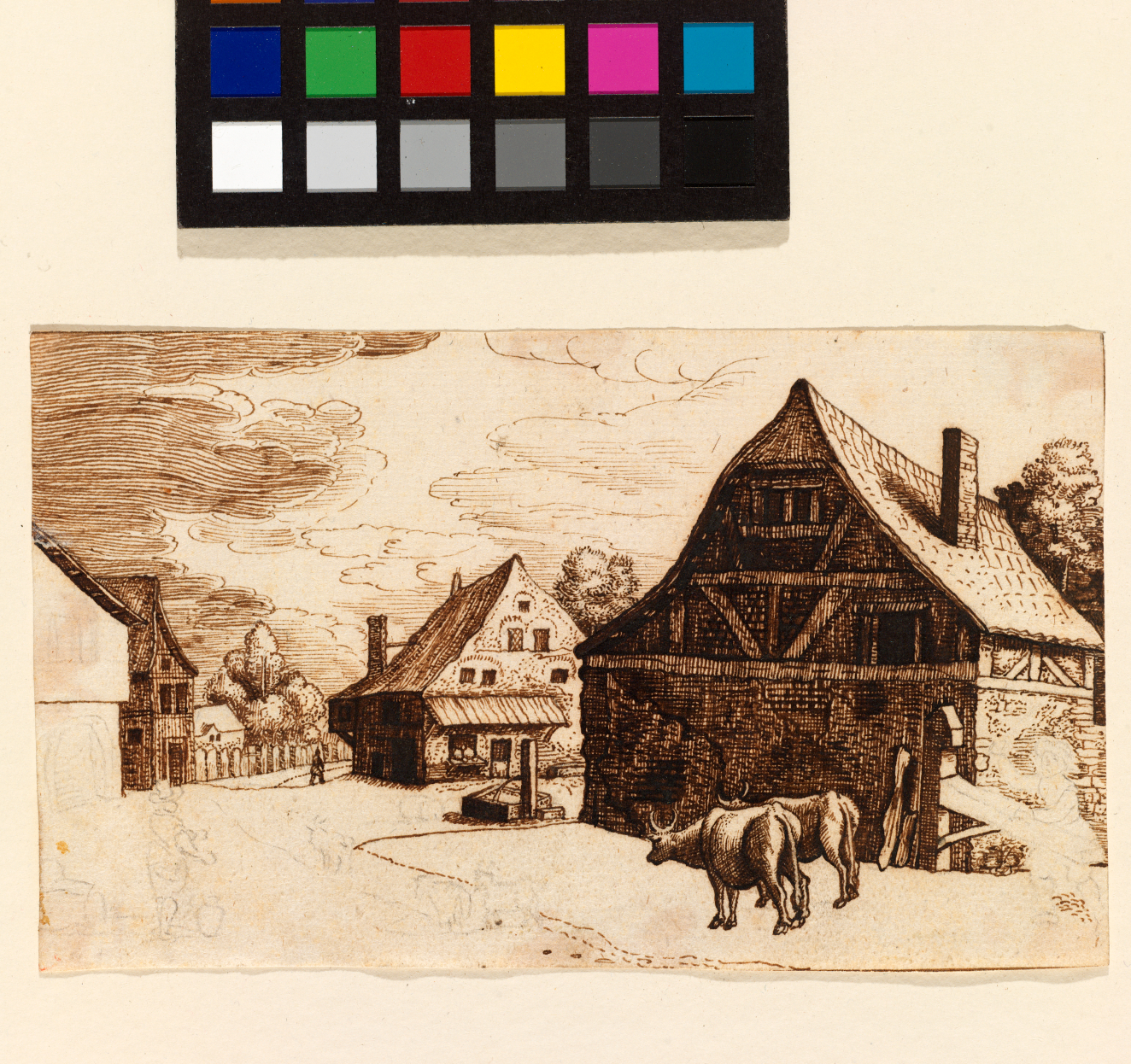 A pen and ink drawing of Hercules and other figures in a physical. Floating in the sky above and behind him are three female allegories: Victory, Honor, and Fame.