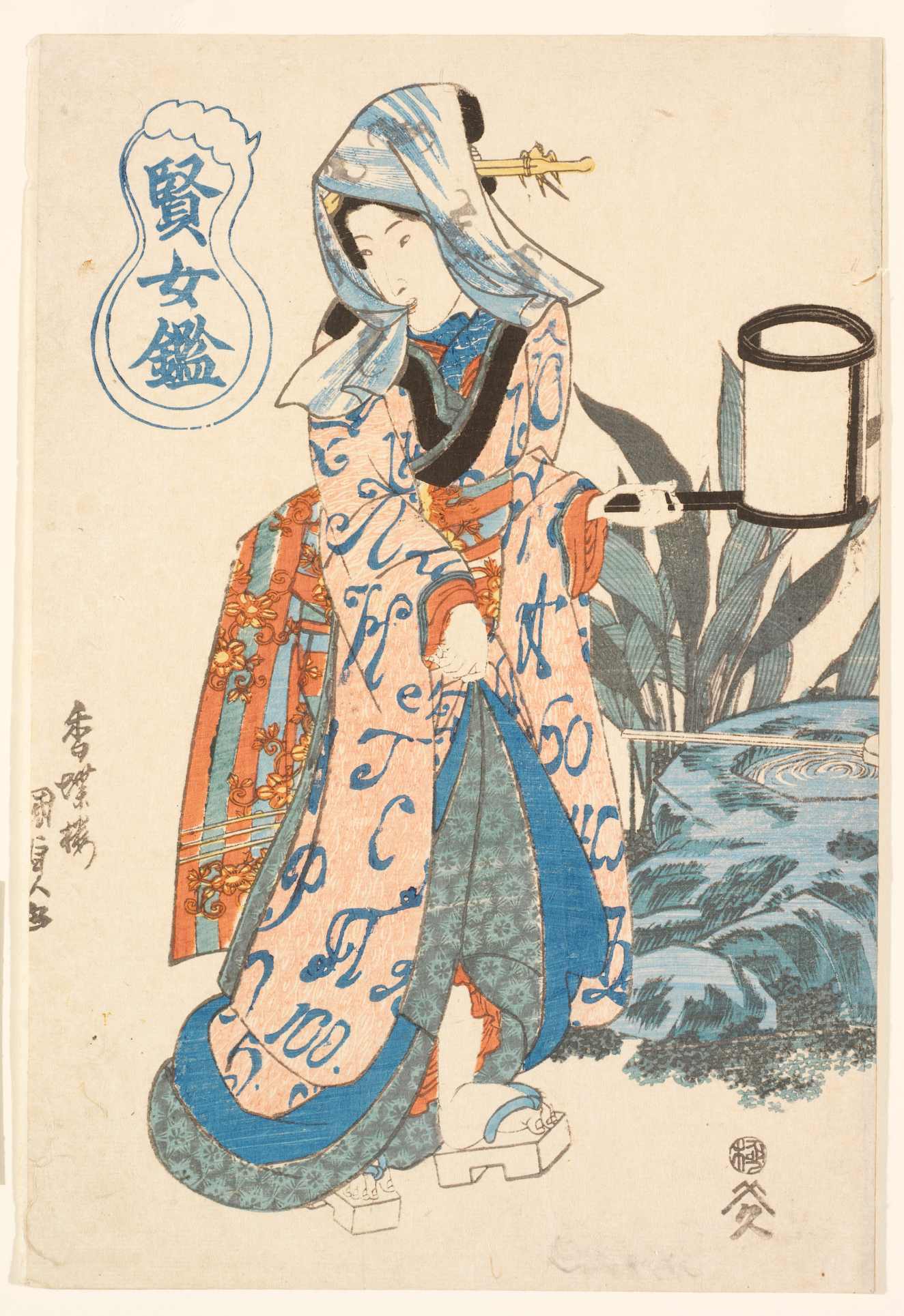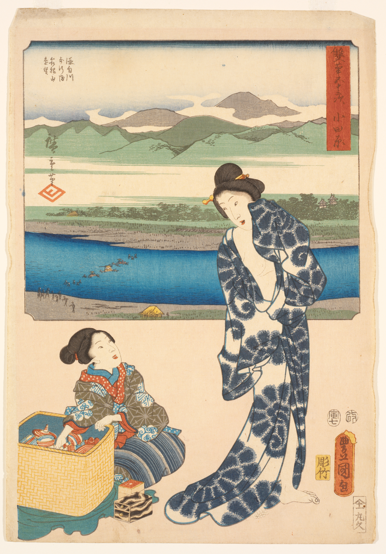 Odawara: Distant view of the Hakone mountains from the Sakawa River (小田原 酒匂川歩行渡 箱根山遠望 Odawara Sakawagawa kachi watashi Hakone yama enbō), Edo Period