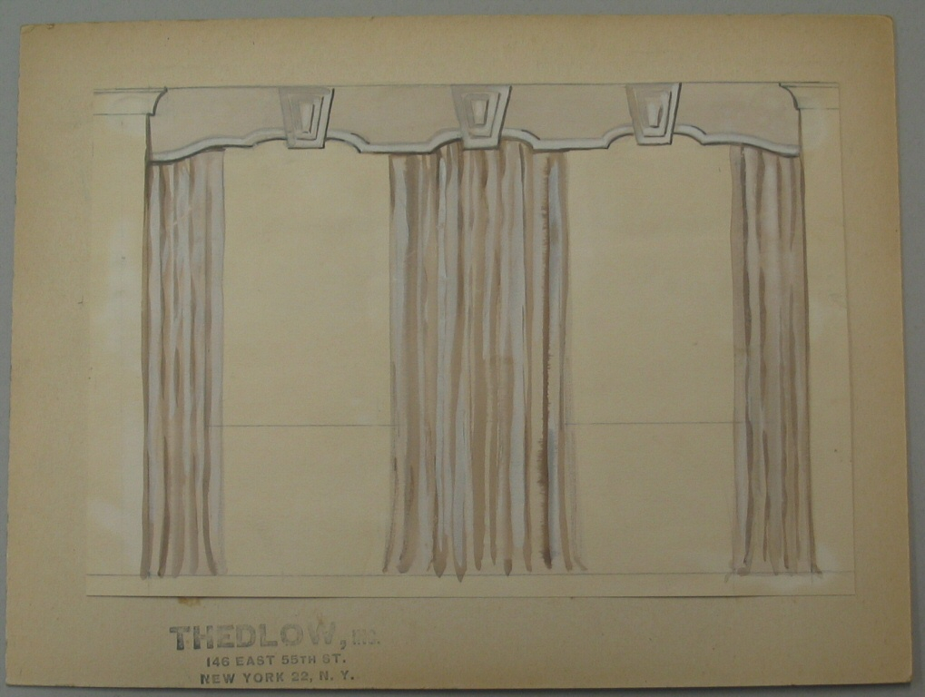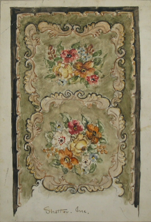Tabletop detail of painted design on same table top and an unrelated bookcase