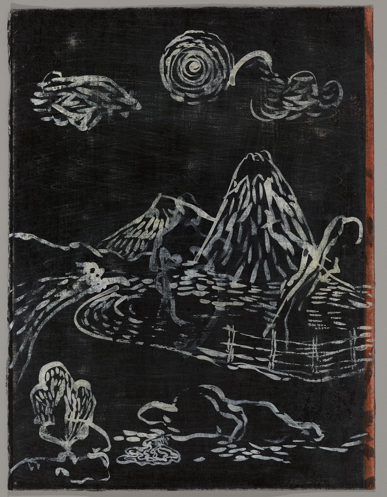 Various colorful images radiate from the center of the page, which features a yellow circle with brown designs. At the lower center, two figures light cigarettes.