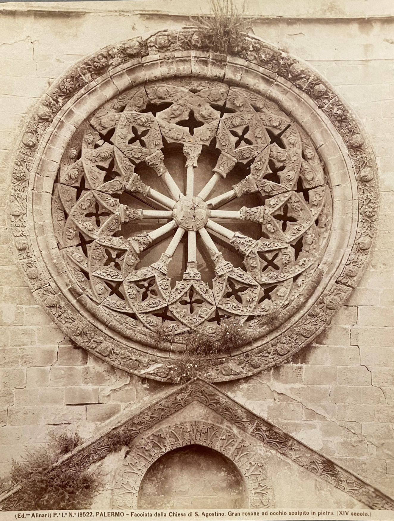 P.e I.a N.o 19522 Palermo--Facciata della Chiesa di S. Agostino Gran rosone od occhio scolpito in pietra. (XIV secolo)