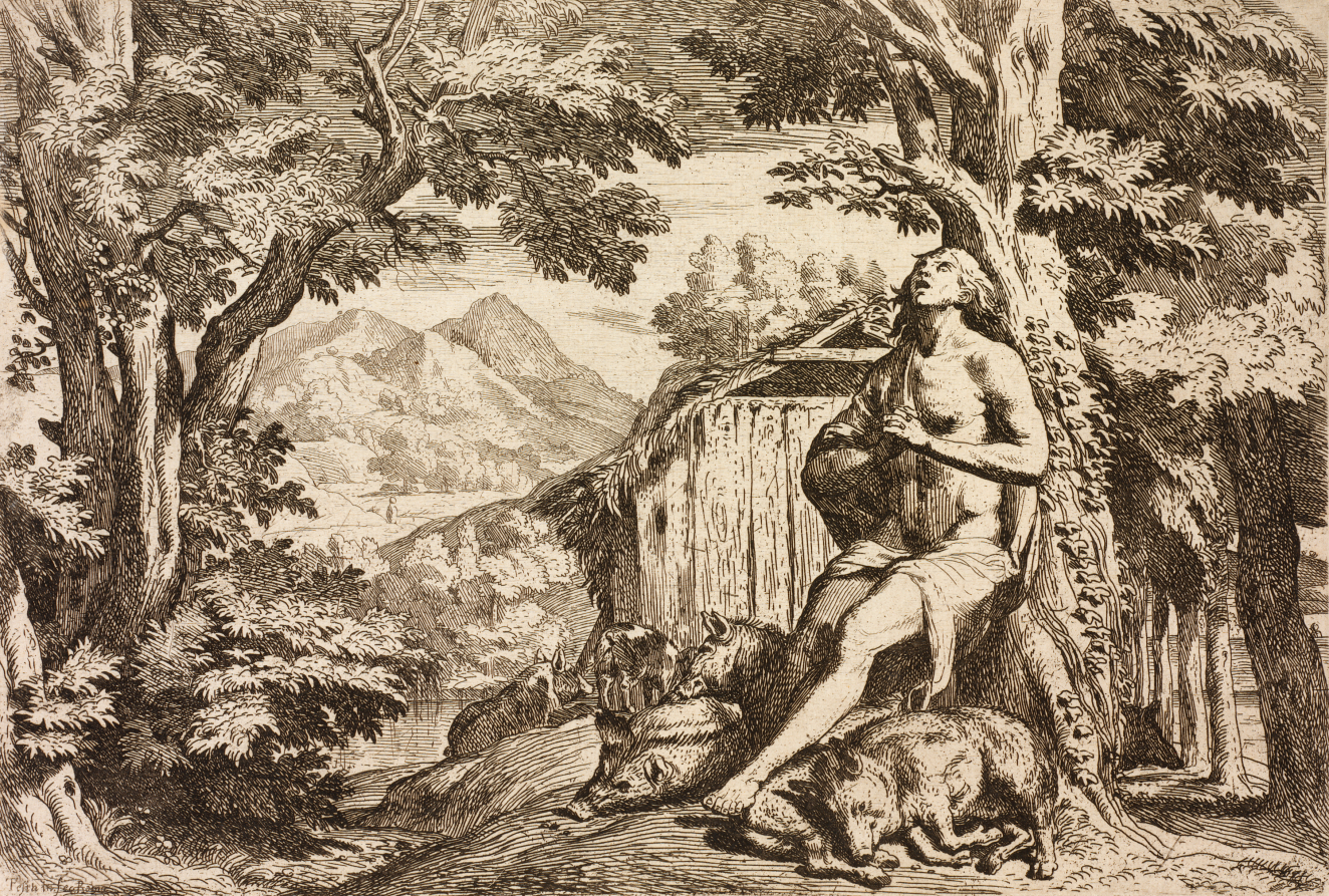 A black and white illustration of a man dressed in formal attire and top hat, closely examining a large sheet of paper while standing in shallow water in a forest.