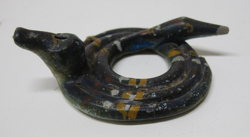 Long vertically beaded rectangle with bright colorful tassels and long wavy purplish hair coming from the bottom. The tassels are orange and connect to green, red, and yellow threads.