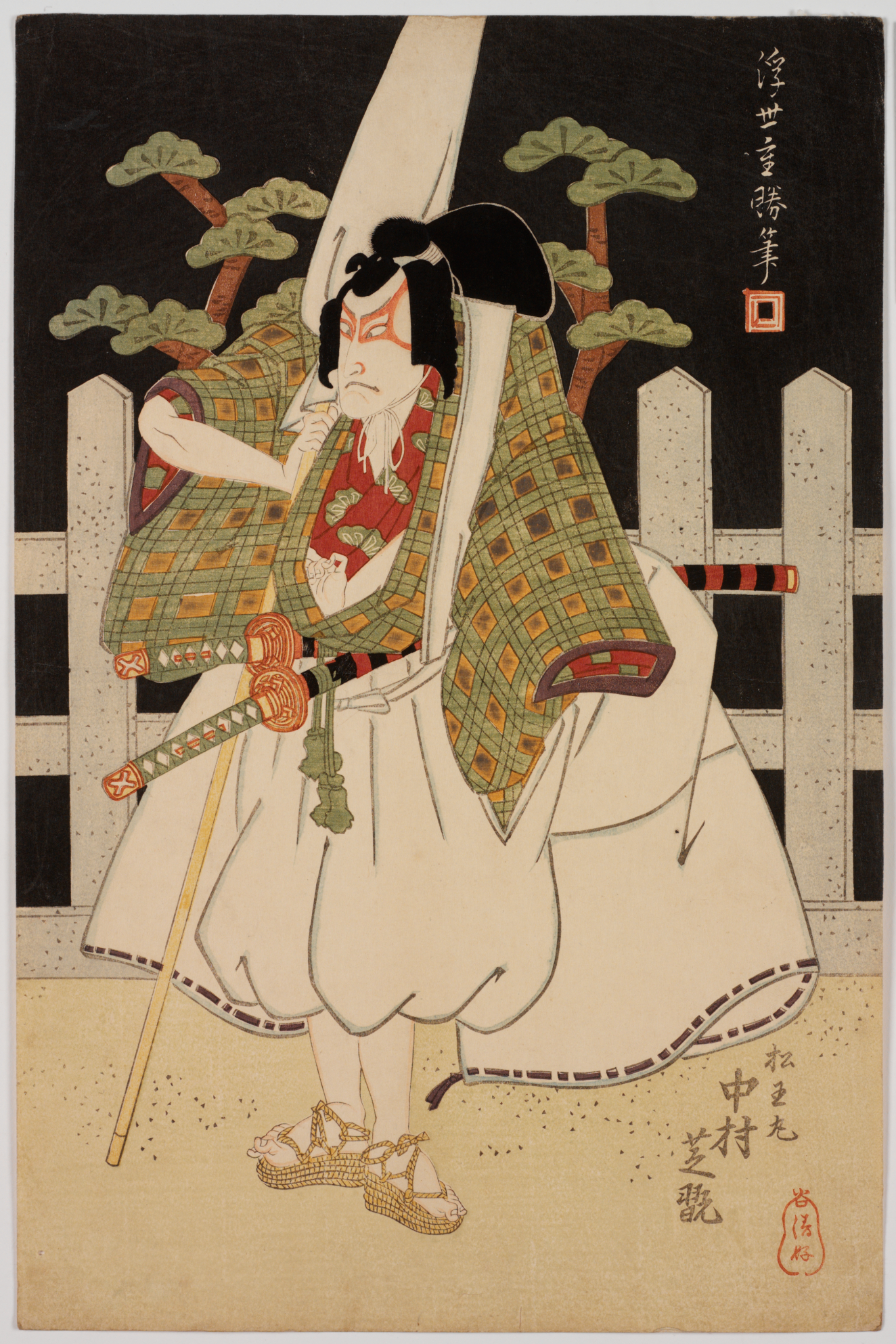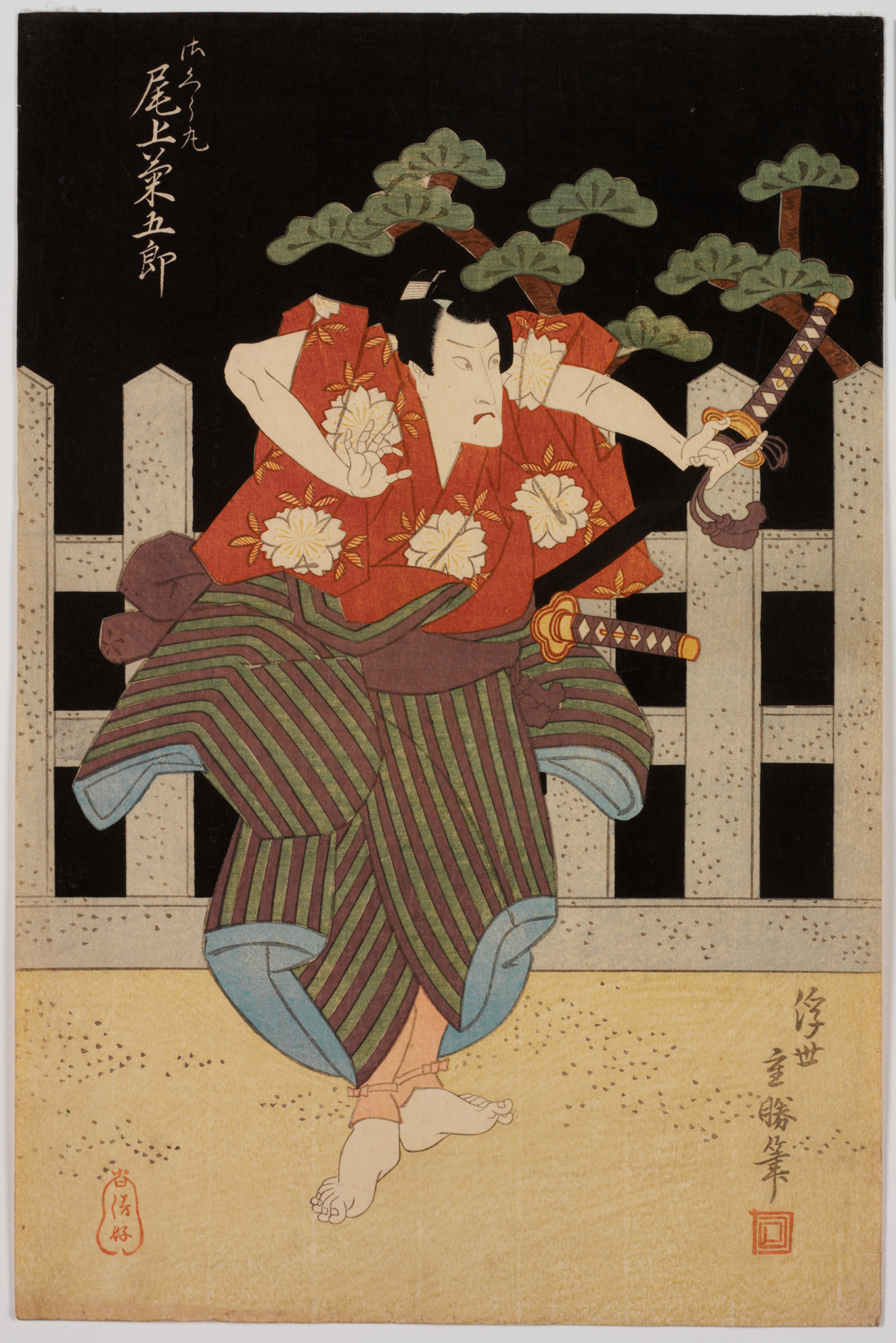 Nakamura Utaemon III as Matsuomaru Arashi Raishi II as Umeomaru and Onoe Kikugoro III as Sakuramaruin the scene "Pulling the carriage apart' (Kuruma biki) from the play Sugawara's secrets of calligraphy (Sugawara denju tenarai kagami), Edo (Japanese period)