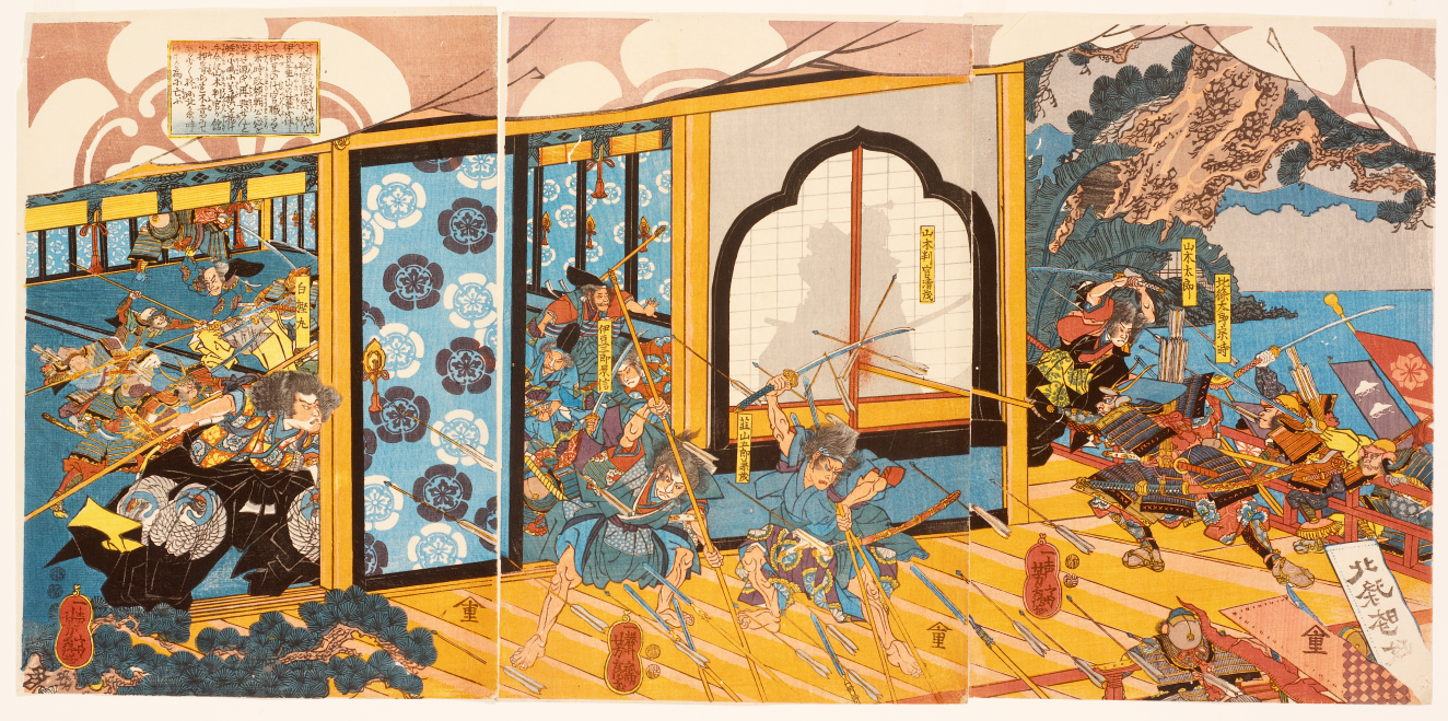 Opening siege of Minamoto no Yoritomo: Hojo Tokimasa and others attack Yamaki Hangan at his mansion (Minamoto no Yoritomo no hataage Hojo Tokimasa sono hoka Yamaki Hangan no yashiki ni oshiyoseru), Edo Period