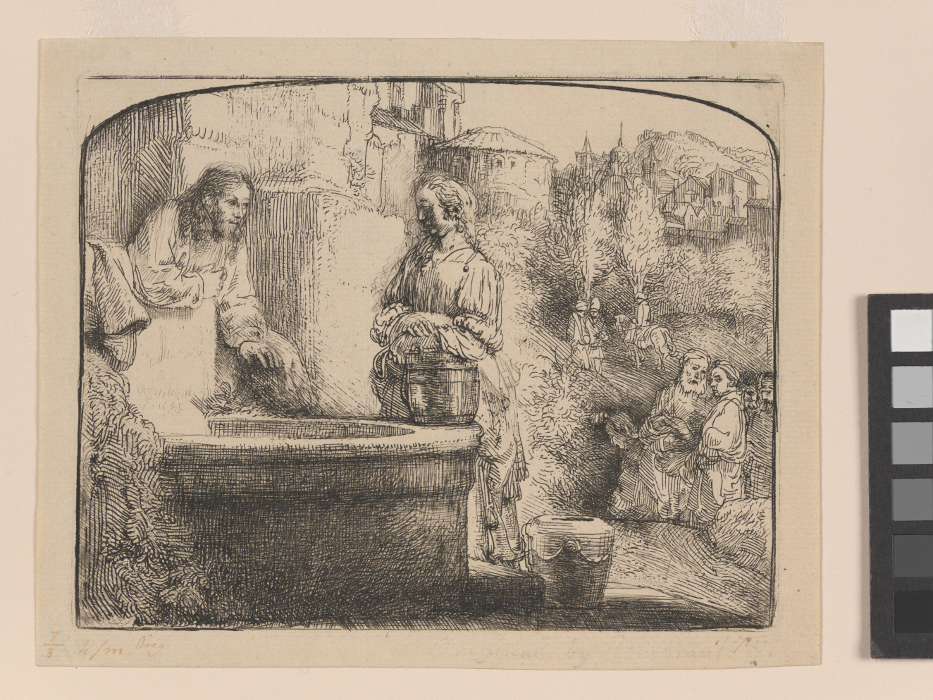 A loosely drawn pen and ink sketch of Saint Jerome and Saint John. Jerome is with a lion and cherub and John, to his right, looks downward toward a lamb.