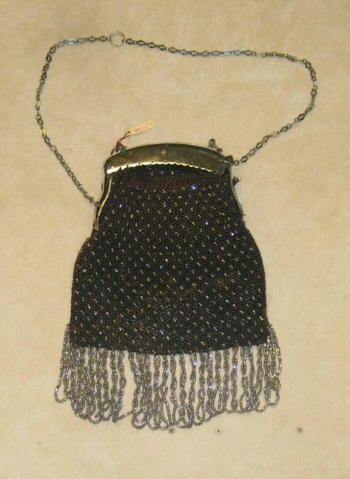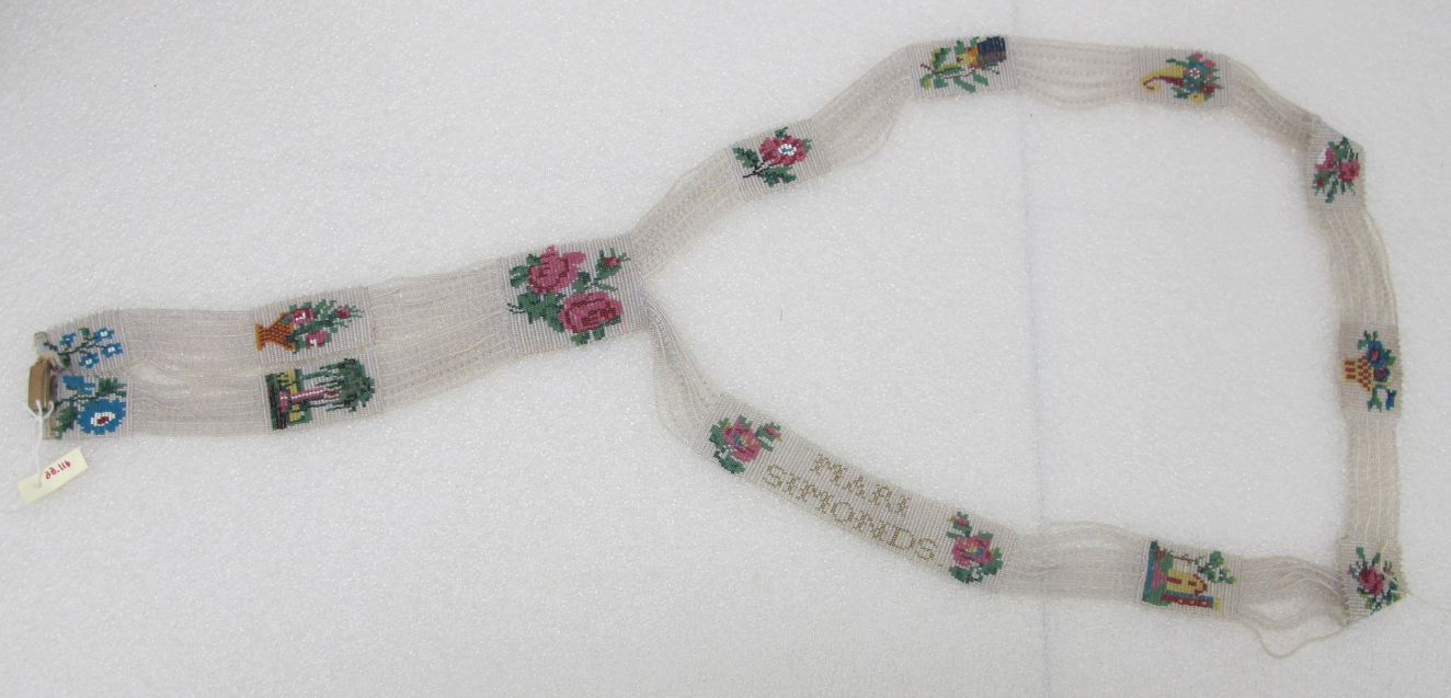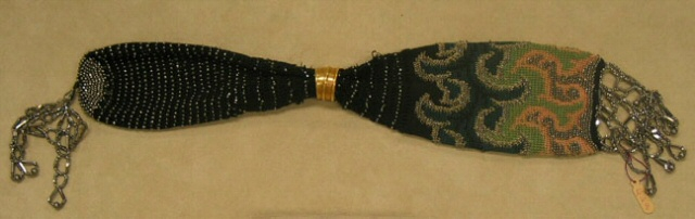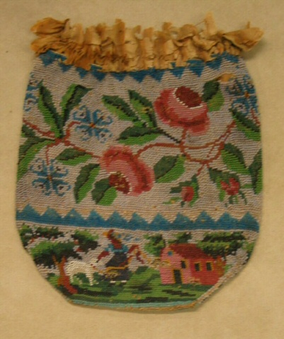Beaded bag with its flap partially open, featuring wavy green, blue, and cream stripes framing a red body and top, both of which feature detailed green and white floral embroidery.